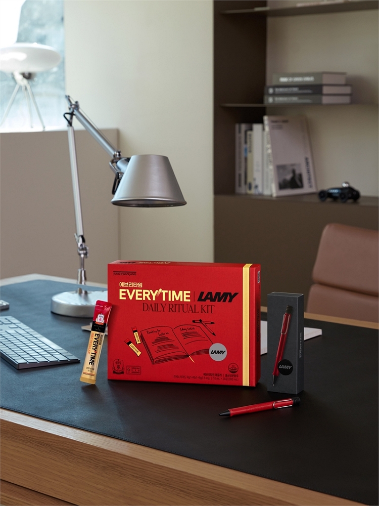KGC인삼공사에 따르면 에브리타임xLAMY 데일리 리추얼은 일상 건강을 챙기는 건강기능식품과 나만의 하루를 기록할 수 있는 필기구가 함께 구성됐다. 매일 하루를 설계하며 자기관리에 힘쓰는 현대인들의 라이프스타일을 모티브로 꾸준한 루틴을 통해 지속가능하고 건강한 삶을 지향하는 브랜드 가치관을 담았다.